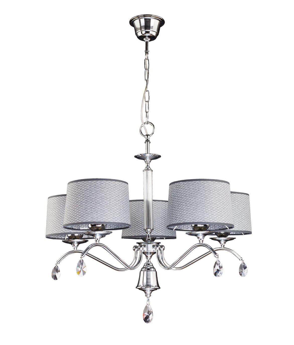 - chrom + przeźroczyste kryształy + wzorzysty szary abażur.